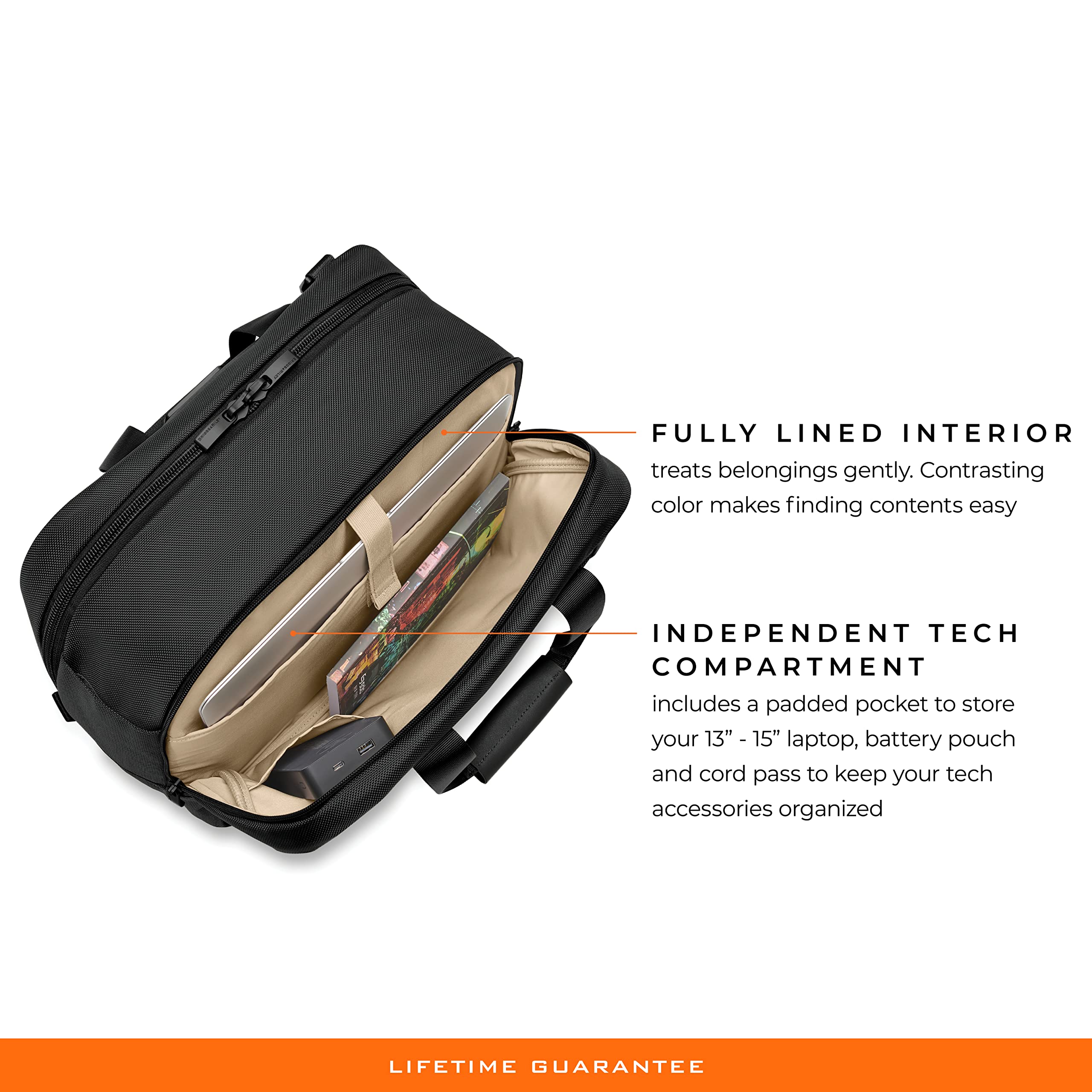 - Slip-through back panel: Allows bag to slide over the Outsider handle of a Briggs & Riley rolling bag for easy transport of two bags as one